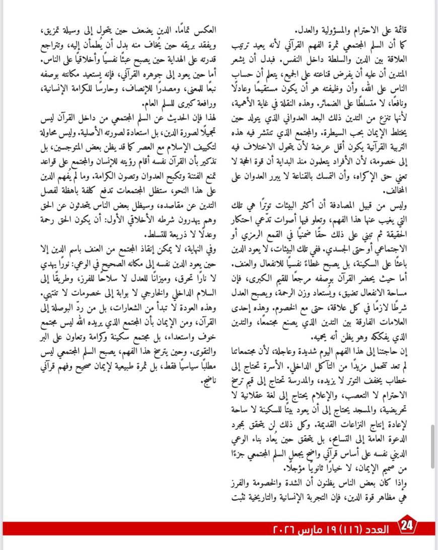 إلى أن السلم المجتمعي ليس قيمة هامشية، بل ثمرة مباشرة للفهم الصحيح للقرآن. ويشرح أن الخطاب الديني حين ينفصل عن قيم الرحمة والعدل وضبط النفس وكرامة الإنسان يتحول إلى مصدر توتر وتمزيق، بينما يضمن الوعي القرآني بناء مجتمع أكثر توازنًا وأقل قابلية للكراهية والعنف والإقصاء.
