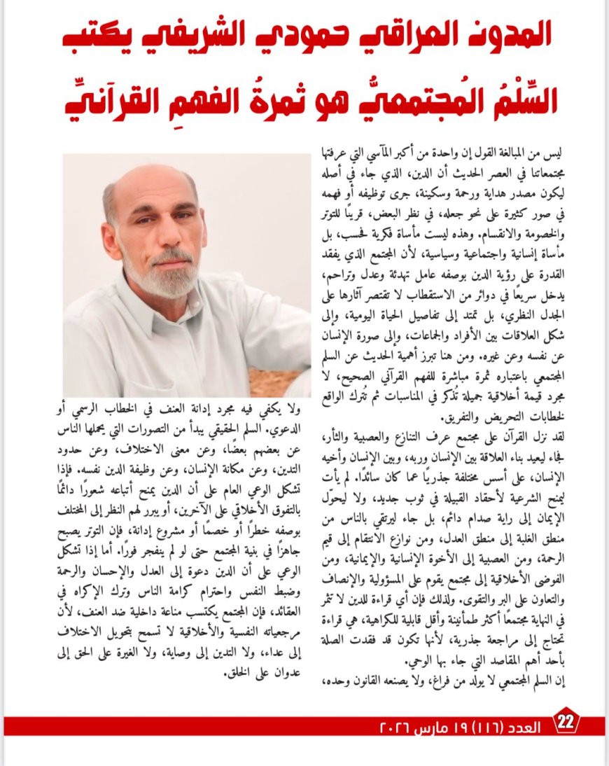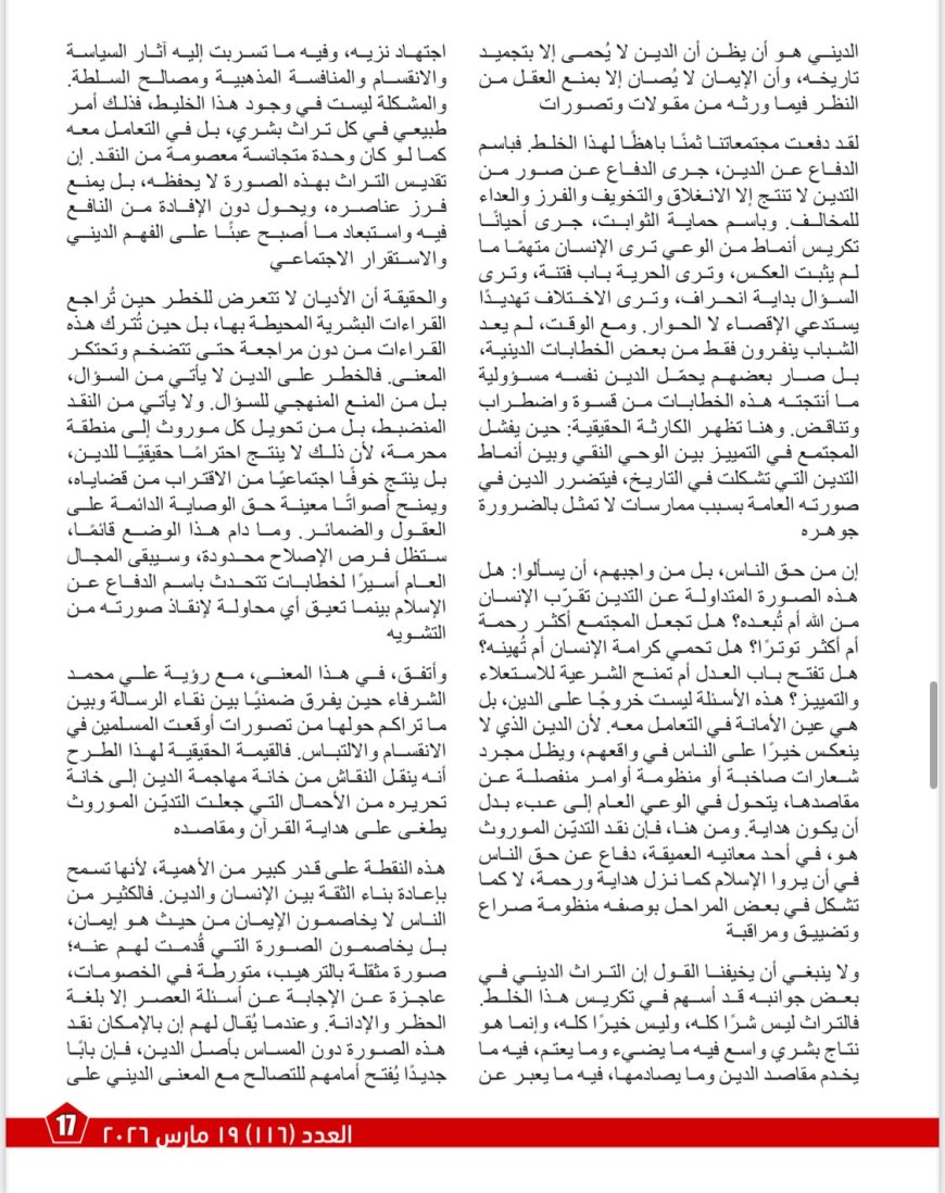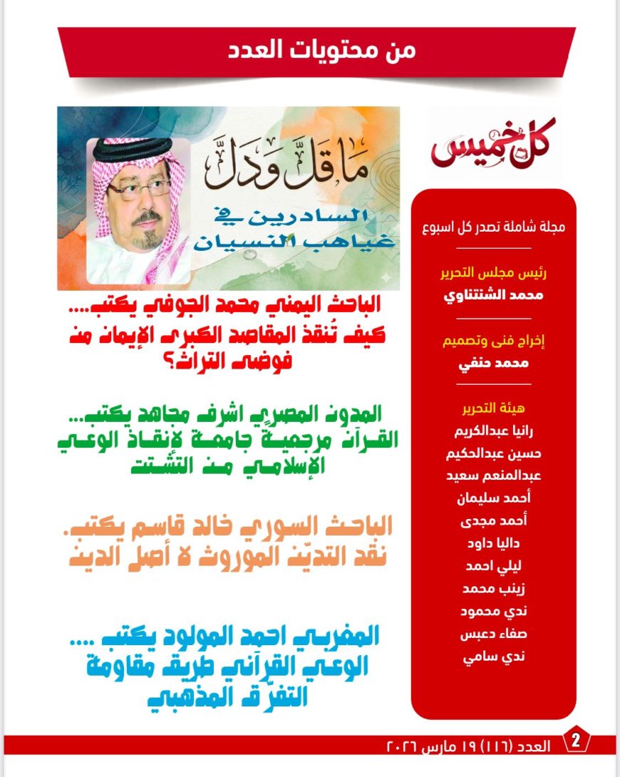 تضمن العدد مناقشة مقال المفكر العربي الاستاذ علي محمد الشرفاء الحمادي بعنوان «الغارقون في التراث»، في معالجة تحريرية تعكس توجه المجلة نحو فتح نقاش معرفي رصين حول قضايا الوعي الديني، ومرجعية القرآن الكريم، وحدود العلاقة بين النص الإلهي والموروث البشري، وأثر ذلك كله في واقع المسلمين المعاصر.