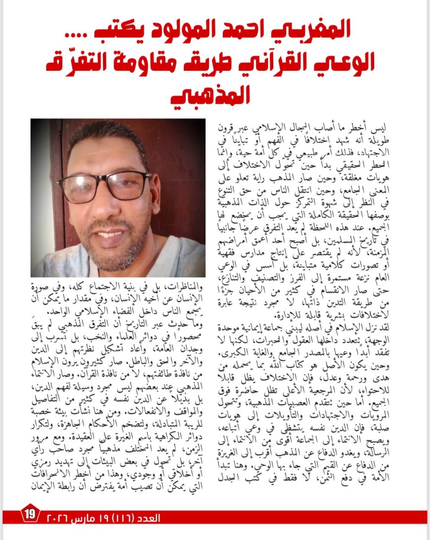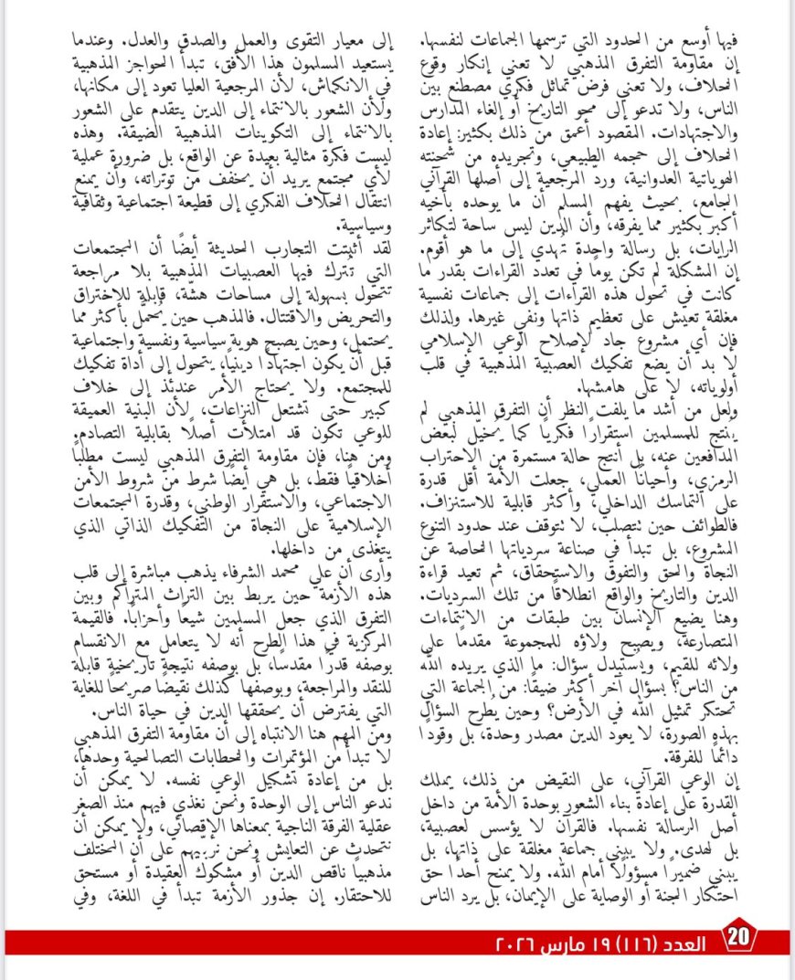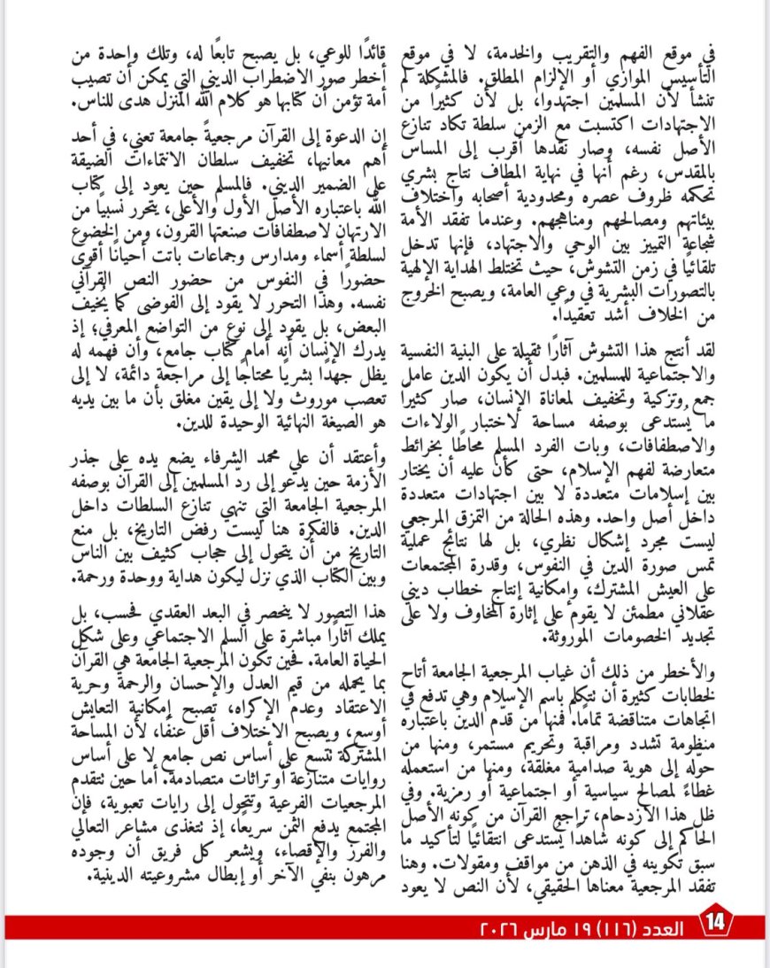 بينما يركز مقال «القرآن مرجعيةً جامعة لإنقاذ الوعي الإسلامي من التشتت» على أن أزمة المسلمين اليوم لا تكمن في قلة الخطاب الديني، بل في غياب المرجعية الجامعة التي تردّ الخلافات إلى أصل حاكم وواضح. ويؤكد أن جعل القرآن المرجعية الأولى يعيد ضبط العلاقة بين الوحي والاجتهاد، ويخفف من سطوة المرجعيات الفرعية، ويفتح الباب أمام فهم أكثر اتزانًا للإسلام بوصفه رسالة وحدة ورحمة وعدل.