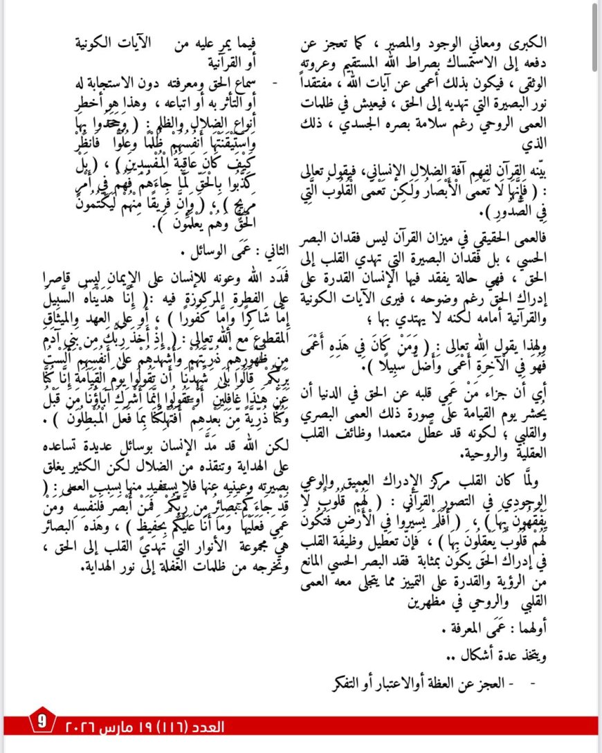 ويأتي مقال «ما قلَّ ودلَّ» في هذا العدد بوصفه امتدادًا منهجيًا وروحيًا لأطروحة الشرفاء، إذ ينقل النقاش من نقد التراث إلى بيان أثر الهداية القرآنية في بناء النفس والوعي والمصير. ويركز المقال على أن الدعوة إلى الله لا تقوم إلا على البصيرة، وأن الإنسان حين يُعرض عن هدى الله يدخل في مسار النسيان والضياع، بينما يكون اتباع الوحي طريق النجاة من الضلال والشقاء. كما يتتبع المقال أسباب السقوط في نسيان الله، من اتباع الهوى والغفلة والاستكبار وصحبة السوء والانشغال بزينة الدنيا، ليؤكد في النهاية أن البصائر القرآنية هي النور الذي يخرج الإنسان من ظلمات الغفلة إلى نور الهداية.