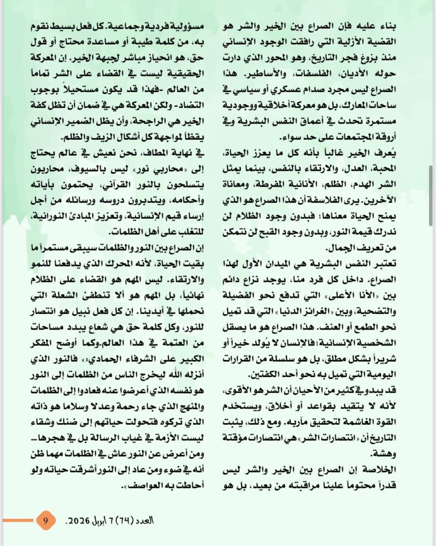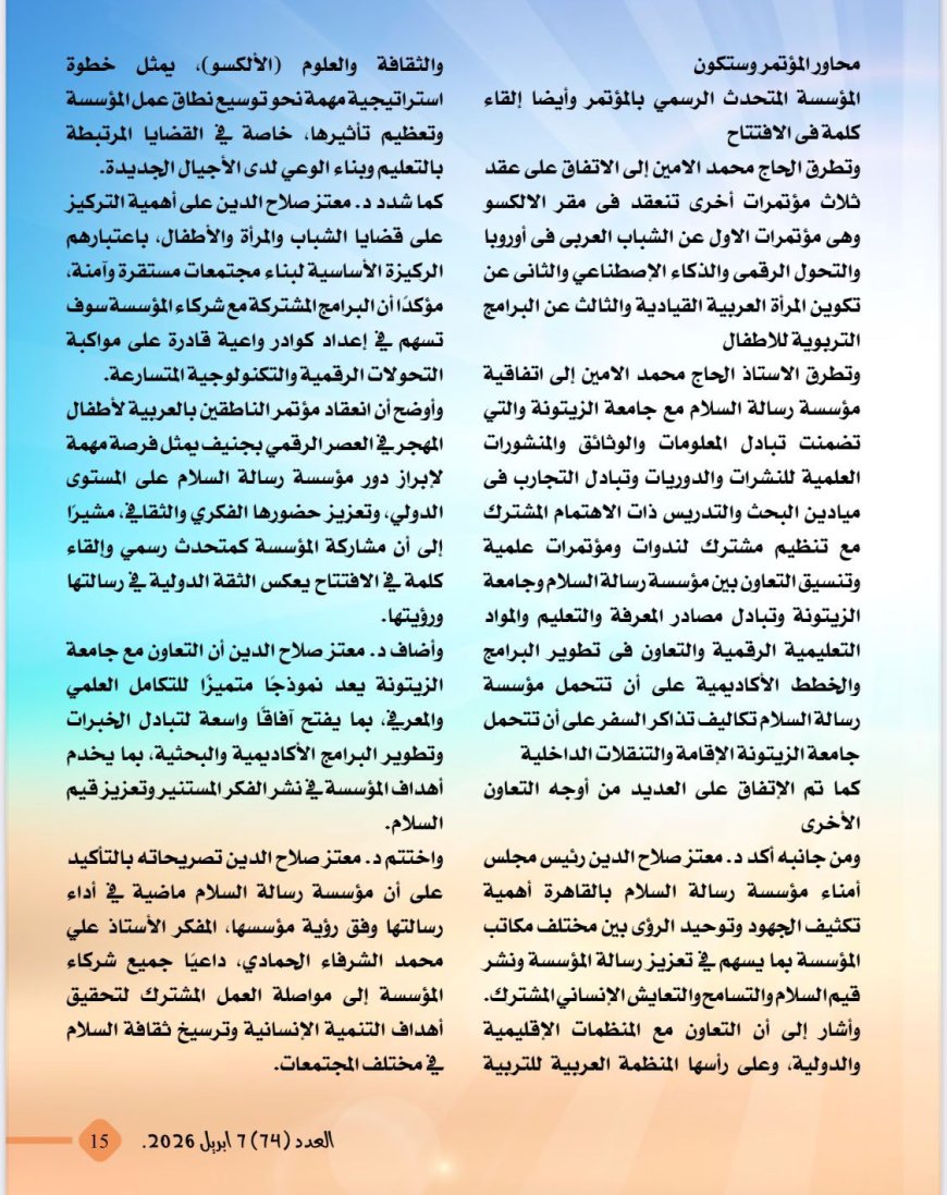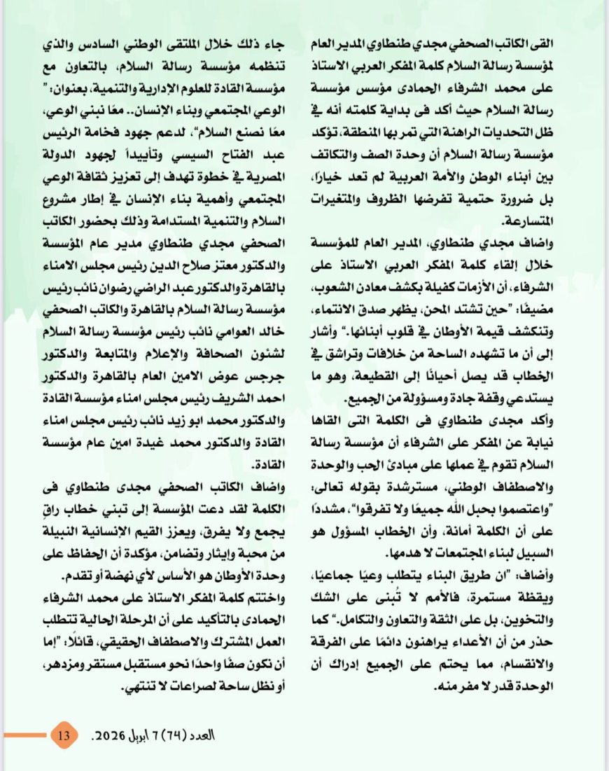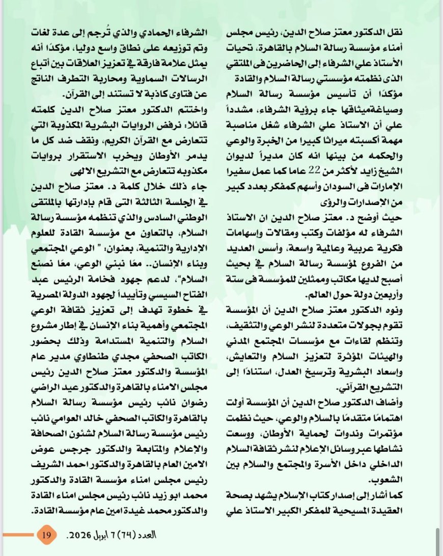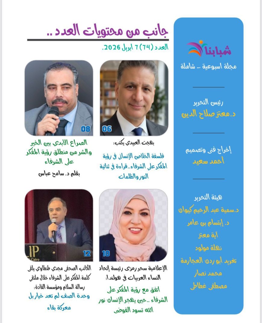 صدر اليوم الثلاثاء 7 أبريل 2026 العدد الجديد من مجلة شبابنا التى تصدر عن مؤسسة رسالة السلام العالمية