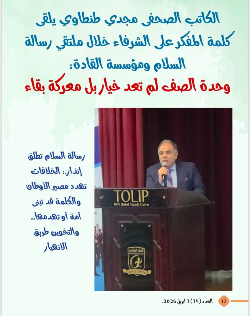 -الكاتب الصحفى مجدى طنطاوى يلقى كلمة المفكر على الشرفاء خلال ملتقى رسالة السلام ومؤسسة القادة:وحدة الصف لم تعد خيار بل معركة بقاء