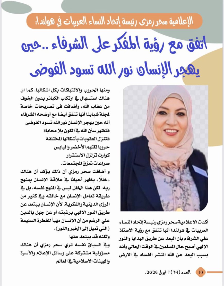 -الاعلامية سحر رمزى رئيسة إتحاد النساء العربيات في هولندا :اتفق مع رؤية الشرفاء