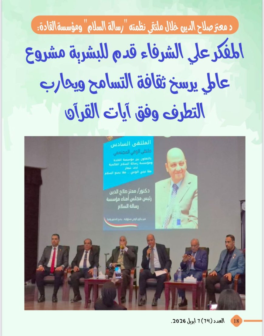 -د. معتز صلاح الدين خلال ملتقى نظمته "رسالة السلام"ومؤسسة القادة:المفكر على الشرفاء قدم للبشرية مشروع عالمى يرسخ ثقافة التسامح ويحارب التطرف وفق آيات القرآن