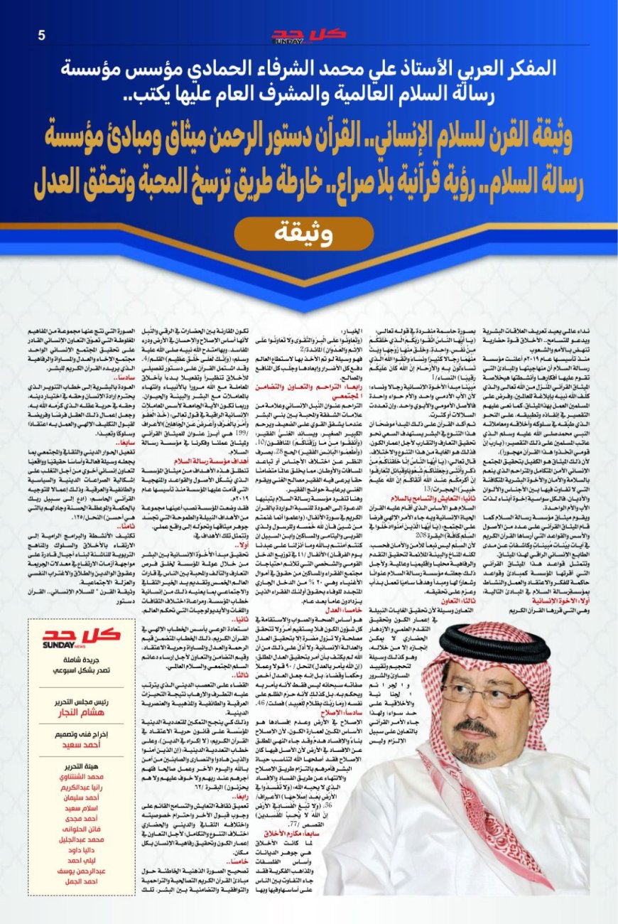 نشر العدد الوثيقة المهمة التي كتبها المفكر الكبير الأستاذ علي محمد الشرفاء الحمادي مؤسس مؤسسة رسالة السلام العالمية بعنوان (وثيقة القرن للسلام الإنساني)