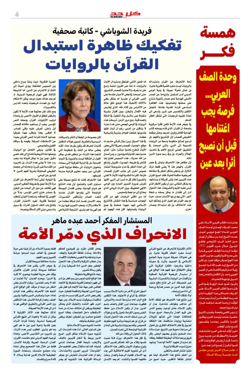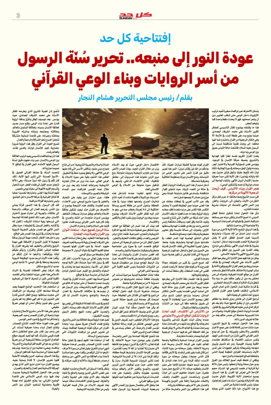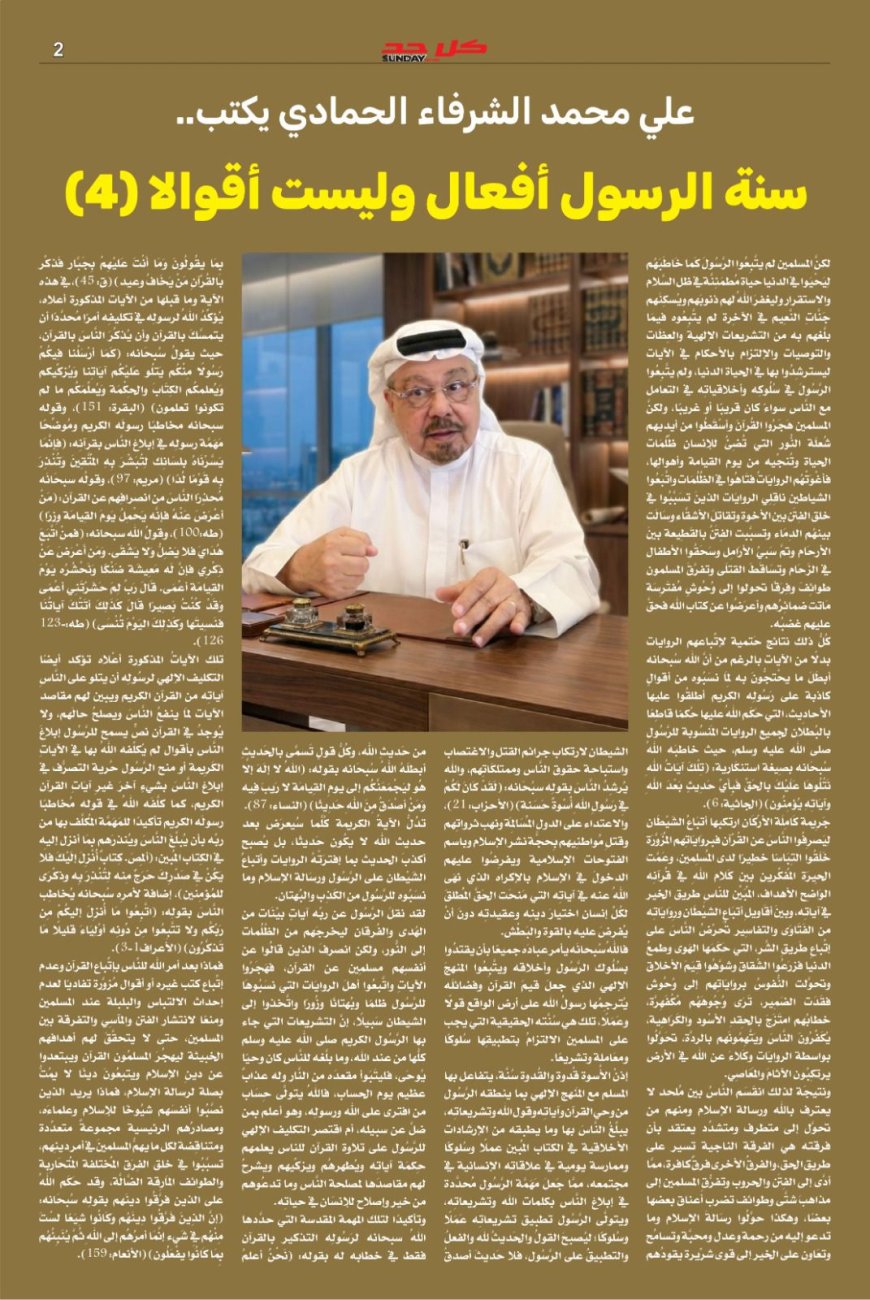 تصدر العدد مقال الكاتب والمفكر العربي الكبير الأستاذ علي محمد الشرفاء الحمادي بعنوان (سنة الرسول أفعال وليست أقوالا ٤)